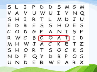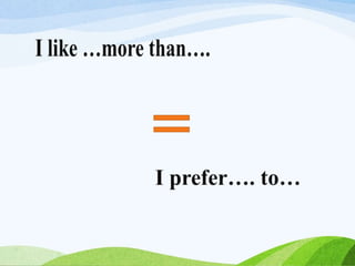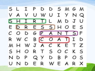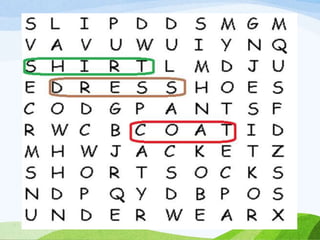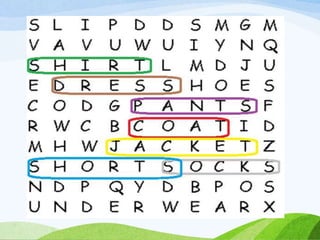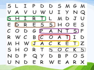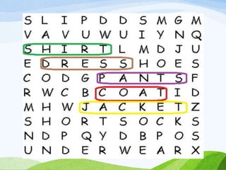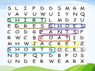 The document is an English lesson plan about clothing preferences. It includes activities for students to learn vocabulary for different types of clothes and discuss which clothes they prefer and why. Students are asked to fill in blanks in a sample text about a boy named Aaron describing the clothes he likes to wear in different situations. He expresses a preference for jeans over other pants because they are comfortable, and a preference for sweatshirts over polos because sweatshirts are cool.