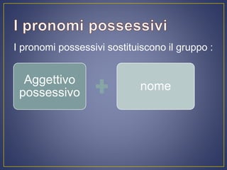 Il documento tratta dei pronomi possessivi in francese, spiegando come sostituiscono gli aggettivi possessivi e variano in genere e numero. Presenta esempi pratici di utilizzo e sottolinea le differenze tra italiano e francese riguardo a pronomi e aggettivi possessivi. Inoltre, fornisce esercizi di completamento e traduzione per praticare l'uso corretto di questi pronomi.