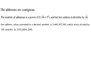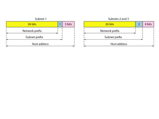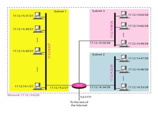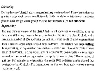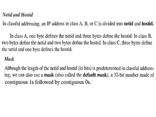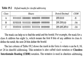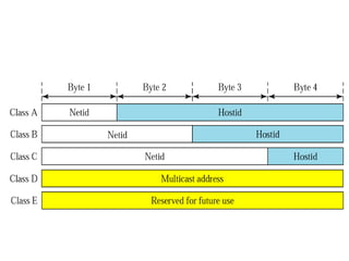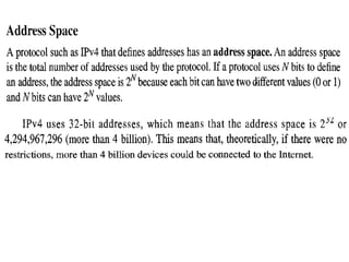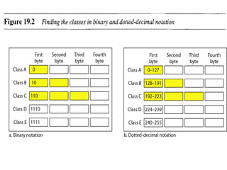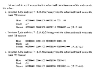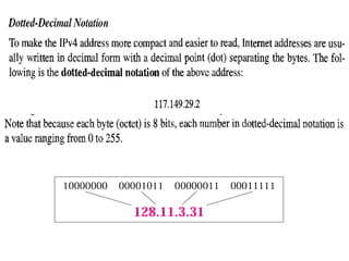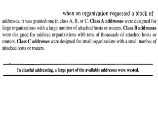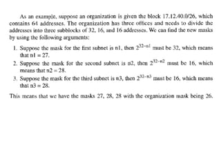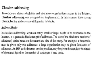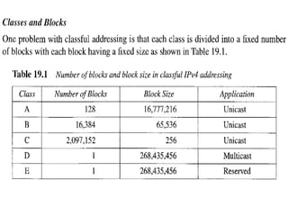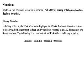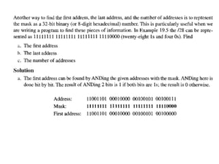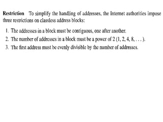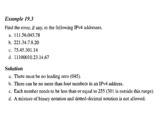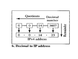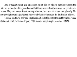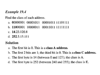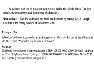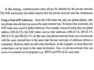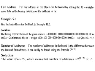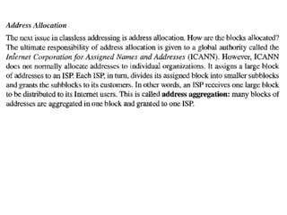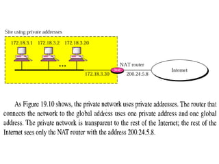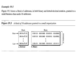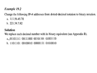 The document discusses IP addressing and network layer concepts. It provides examples of converting IP addresses between binary and dotted-decimal notation. It also describes classful addressing which divides the address space into classes A, B, C, D and E. The document then gives an example of address allocation and distribution to different customer groups. It introduces Network Address Translation (NAT) which allows internal networks to use a large set of private addresses while presenting a single external address.
