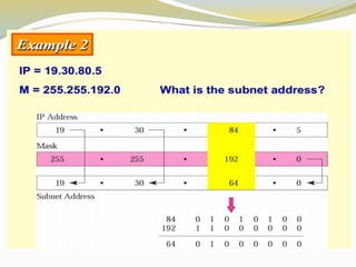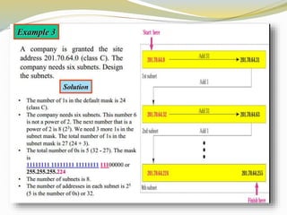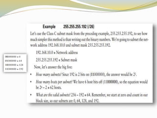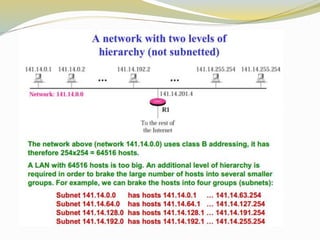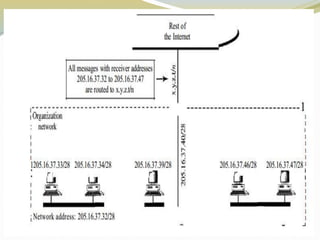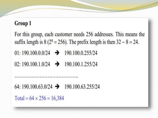 This document discusses the Internet Protocol (IP) version 4 and 6. It describes the key tasks of IP including addressing computers and fragmenting packets. IP version 4 uses 32-bit addresses while IP version 6 uses 128-bit addresses and has improvements like larger address space and better security. The document also covers IP address classes, private addressing, subnetting, Classless Inter-Domain Routing (CIDR), and address blocks.