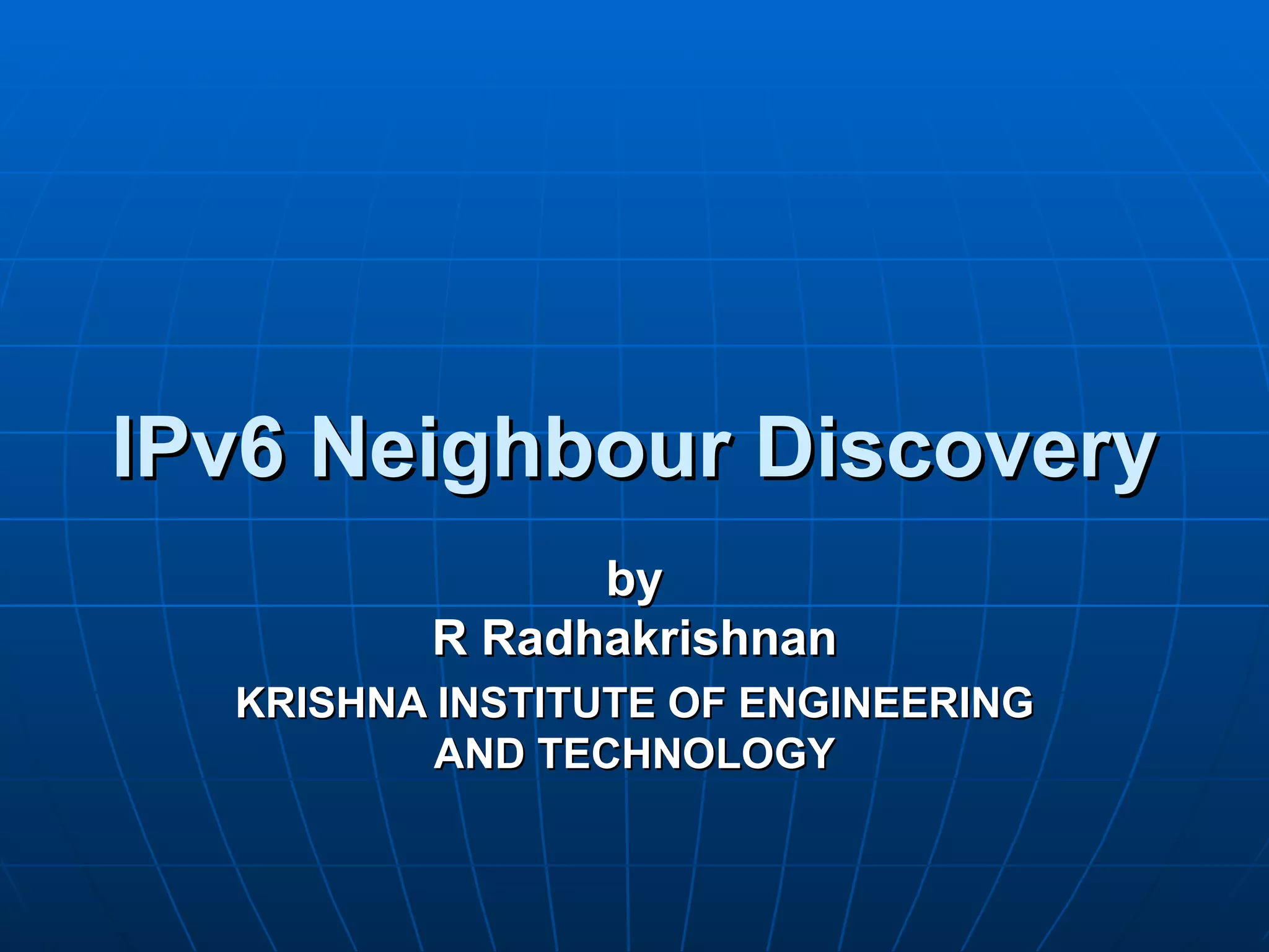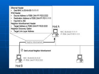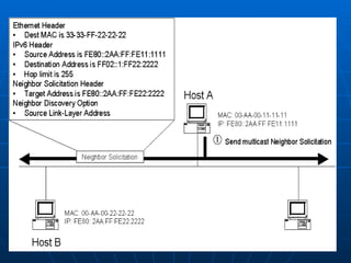 IPv6 Neighbor Discovery replaces ARP and ICMP redirection in IPv4 to determine relationships between neighboring nodes. It has functions for host-router discovery like router solicitation, prefix discovery, and parameter discovery. Neighbor Discovery also has functions for host-to-host communication like address resolution, next hop determination, neighbor unreachability detection, and duplicate address detection.