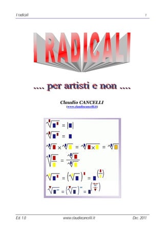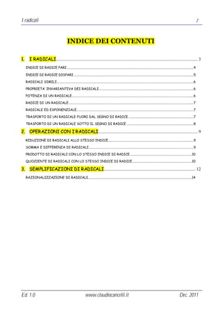 Il documento tratta in dettaglio i radicali matematici, inclusi concetti come indice di radice, radicali simili, operazioni aritmetiche e semplificazioni. Vengono presentate le proprietà invarianti dei radicali e le modalità di trasporto all'interno e all'esterno del segno di radice. Sono forniti esempi pratici per illustrare queste operazioni e concetti.