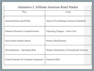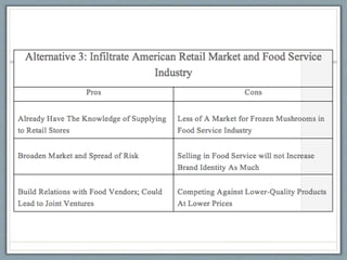 I Roscilli seeks to expand its frozen mushroom and truffle business globally, starting with the US market. Its goals are to introduce its new "gli ExPorcini" branding and establish itself in America using its core competencies of quality products, innovative packaging, and diverse product lines. It will target high-end grocery stores and consumers through education on product benefits. Implementation will start with introduction of family-sized products and innovative packaging with recipes at a lower price point, distributed through an international partner. Promotion will include celebrity endorsements, television ads, trade shows, billboards, and grocery store marketing. After 5 years of growth, adjustments will be made based on consumer preferences and joint ventures pursued, with