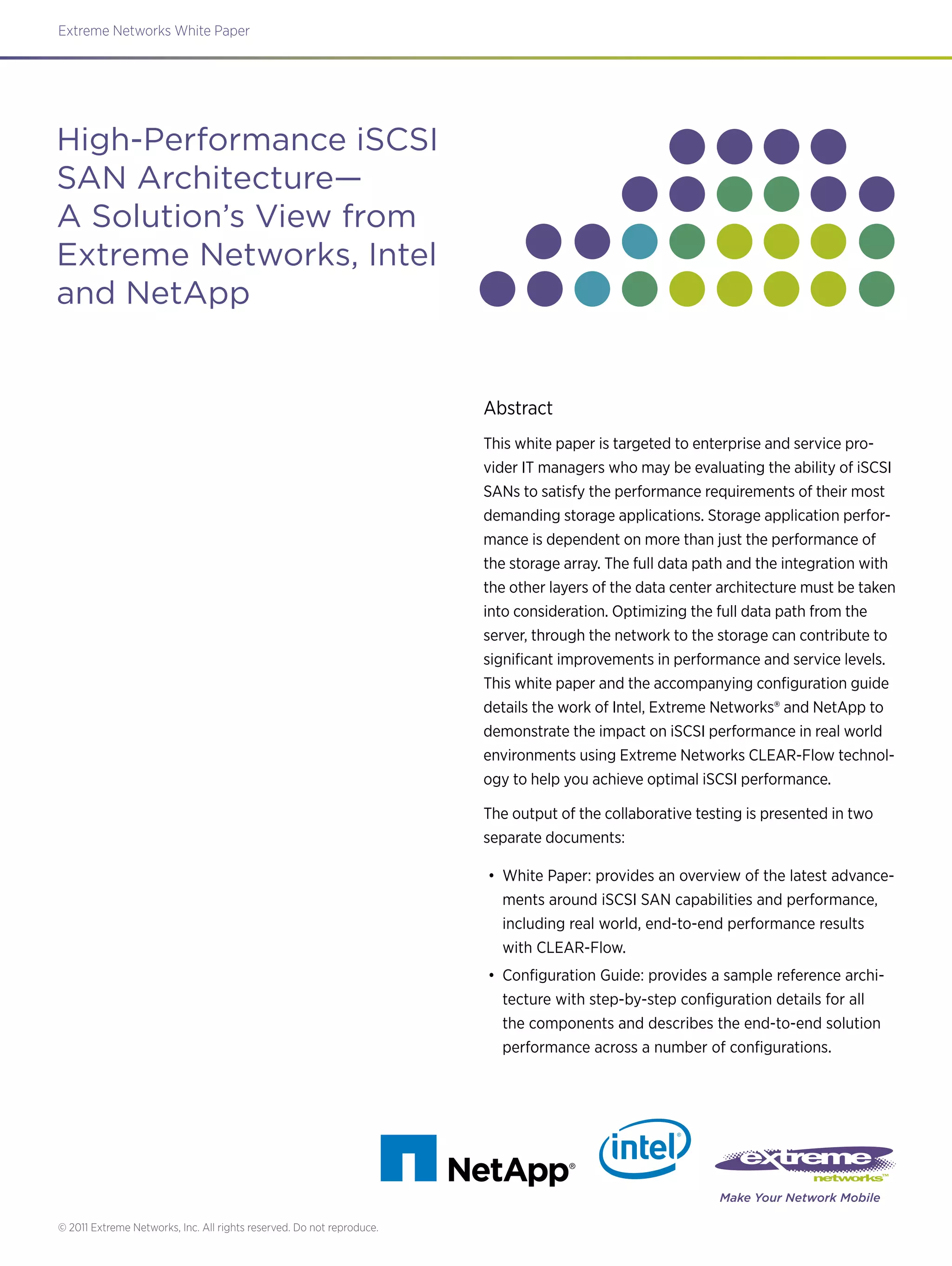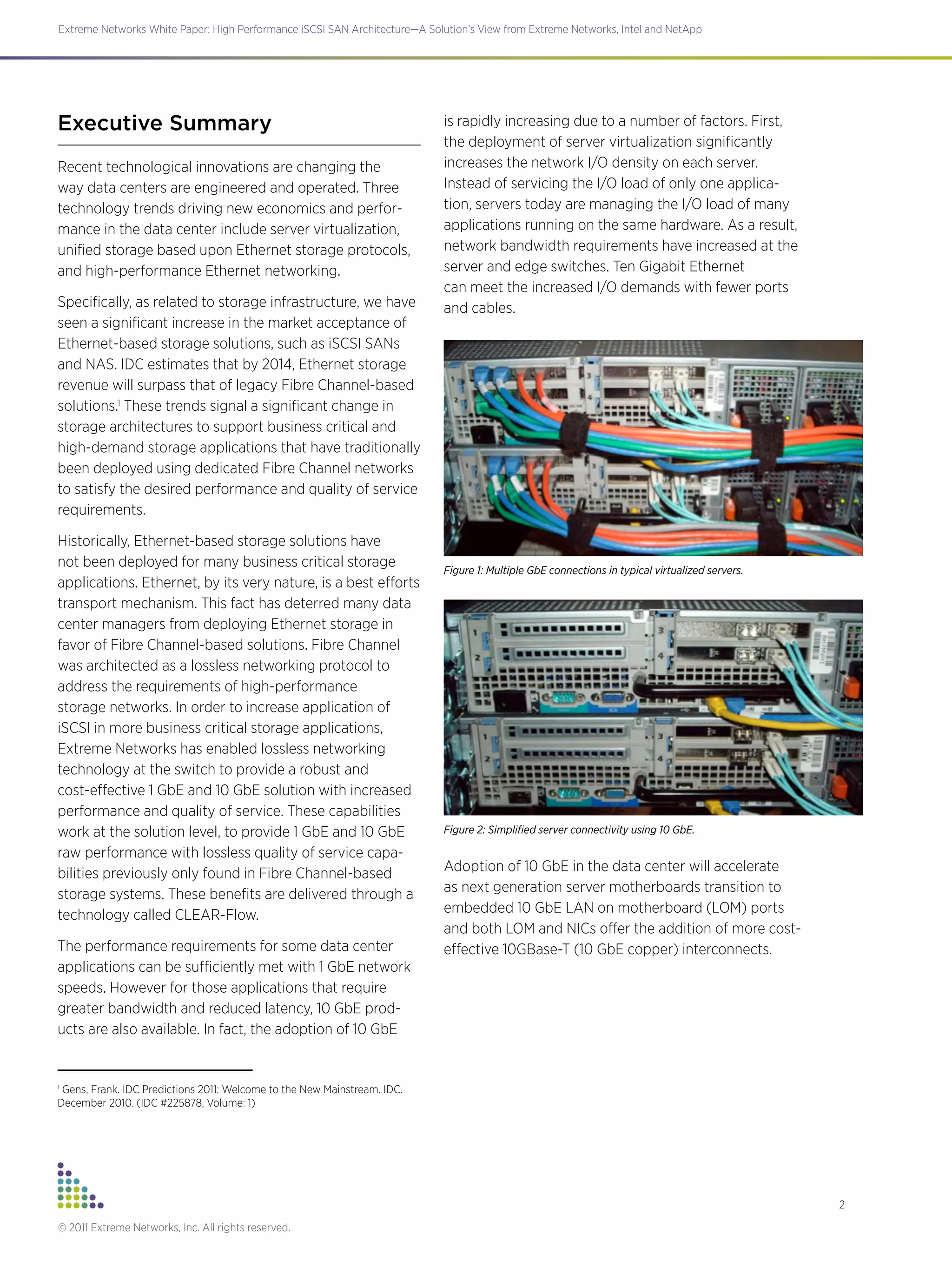 This white paper evaluates the performance of iSCSI storage area networks (SANs) with and without the use of Extreme Networks' CLEAR-Flow technology. Testing was conducted using Intel servers connected via 10GbE NICs to a NetApp storage array, with and without additional traffic introduced between switches. The results show that with CLEAR-Flow, iSCSI performance is maintained even under contention, while without it, throughput is severely limited when contention is present. CLEAR-Flow helps optimize iSCSI performance by automatically identifying and prioritizing iSCSI traffic on the network.