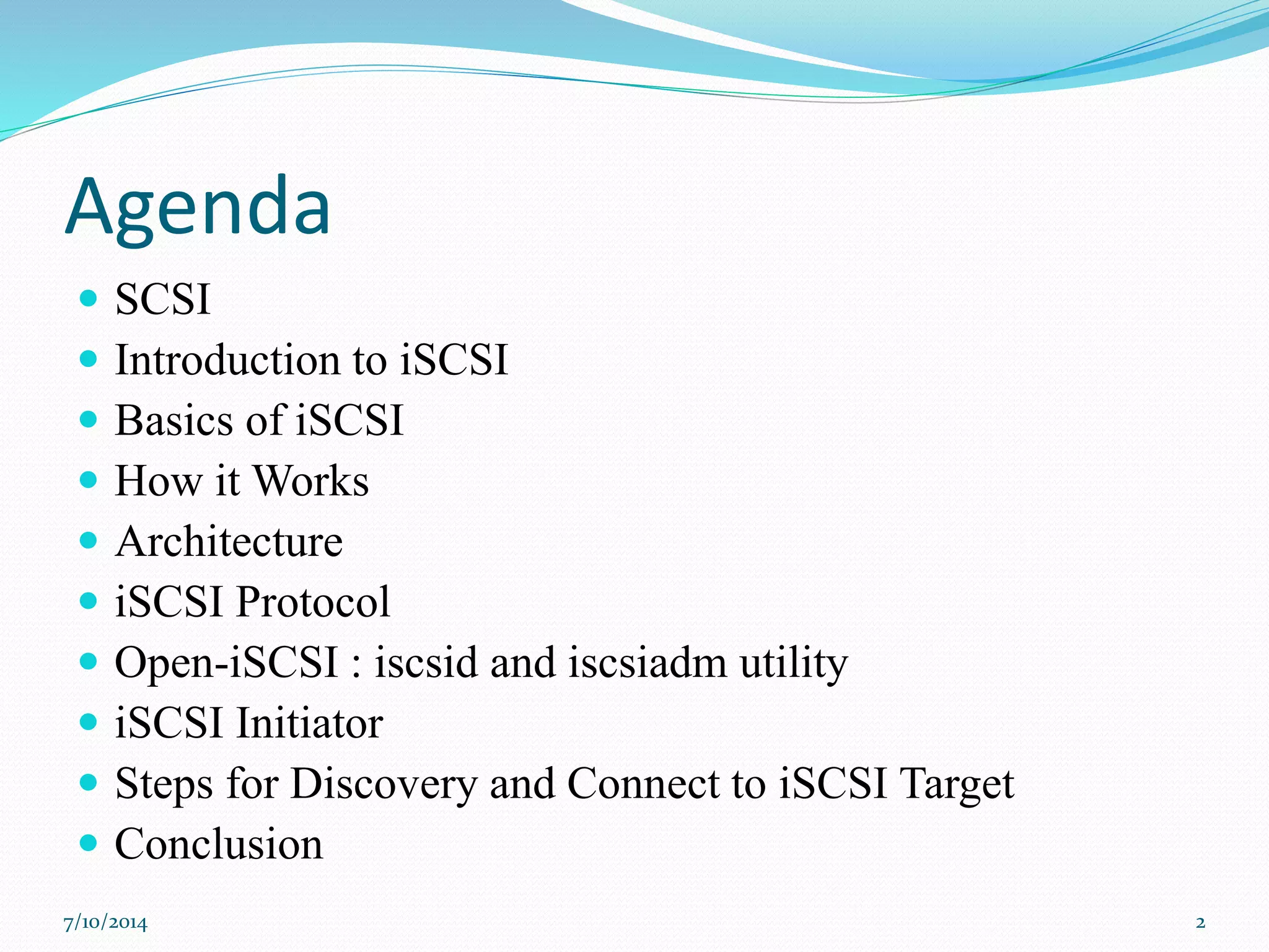 The document provides a detailed overview of the Internet Small Computer Systems Interface (iSCSI), which is an IP-based standard for linking data storage devices over a network. It outlines the components of iSCSI, including initiators and targets, discusses the architecture and protocol details, and explains utility tools like open-iscsi and iscsiadm for managing iSCSI connections. Ultimately, it concludes that iSCSI is a cost-effective alternative to Fibre Channel technology, enabling long-distance data storage across existing network infrastructures.