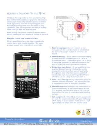 The EZcall iServer is a wireless duress and locating system that can provide precise room-level location for alarm events. Unlike traditional RTLS systems, the iServer uses triangulation algorithms to determine the exact room an alarm was triggered in. When an alarm is received, responders are informed of who activated it and the precise location. The iServer offers scalability, reduced installation costs due to wireless mesh technology, multi-floor locating, and enhanced security for components.