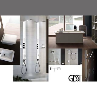 The document details a variety of bath products from Gessi, including specifications such as lengths, colors, and design information. It emphasizes referring to individual country pricelists for availability. Additionally, it provides contact information for Gessi spa in Italy.