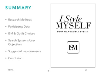 This document summarizes research conducted on an ISM app to support outfit choices. Methods included questionnaires, interviews, and usability testing with 40 respondents and 7 participants. Most participants were female ages 18-29 and considered fashion very or extremely important. The research found ISM fails to support outfit choices because it lacks condition-based searching to find outfits fitting specific weather or occasions. Suggested improvements included adding filters for weather and occasion, improving the search functionality to find options from a user's wardrobe more quickly, and fixing some technical issues like crashing.