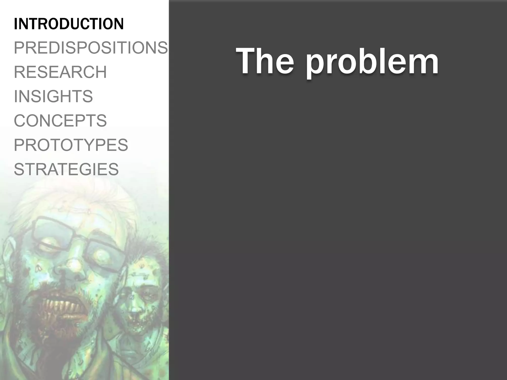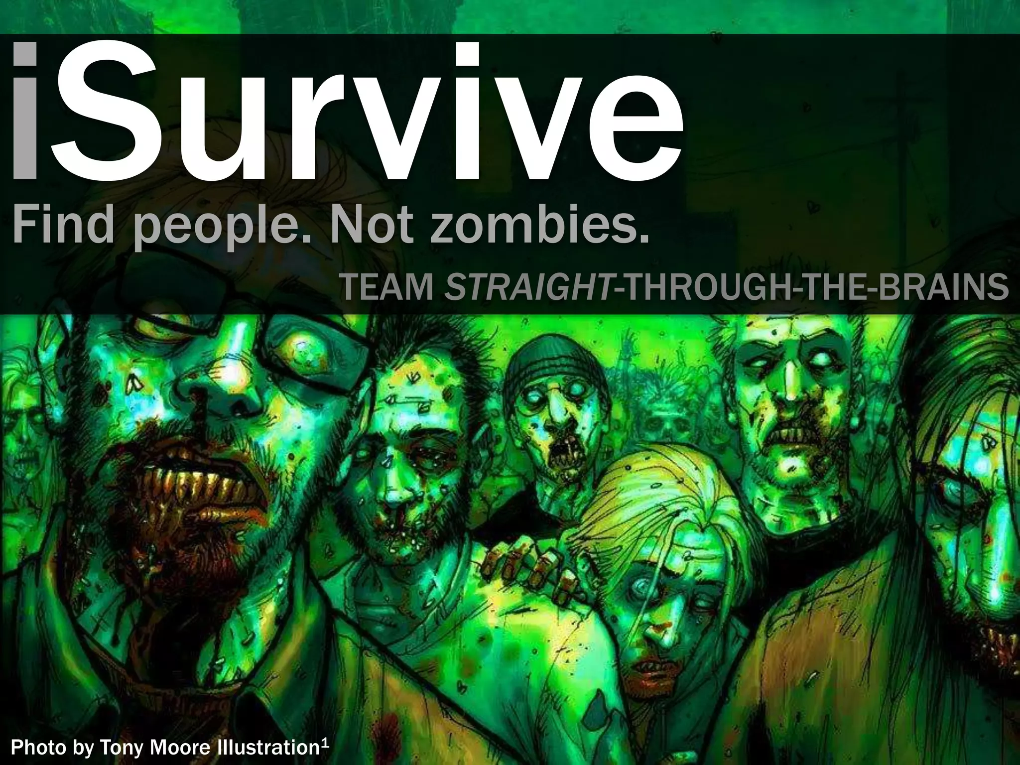 The document describes a mobile app called iSurvive that is designed to help users survive a zombie apocalypse by connecting them with other survivors and providing important survival information. The app allows users to view maps, locate other survivors, join survivor groups, request help, and access tips on first aid, food/water, shelter, and weapons. It was prototyped and tested with users to evaluate usability. The goal is to provide a "buddy system" through the app to help more people survive with minimal interaction.
