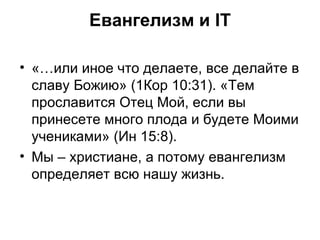 Документ обсуждает различные подходы к евангелизму с использованием информационных технологий и методов, включая пассивный, активный и профессиональный евангелизм. Он предлагает идеи для евангельского служения, а также предостерегает от соблазнов, связанных с этим процессом. Основное внимание уделяется направлению общения с людьми и распространению христианских ценностей в сетевом пространстве.