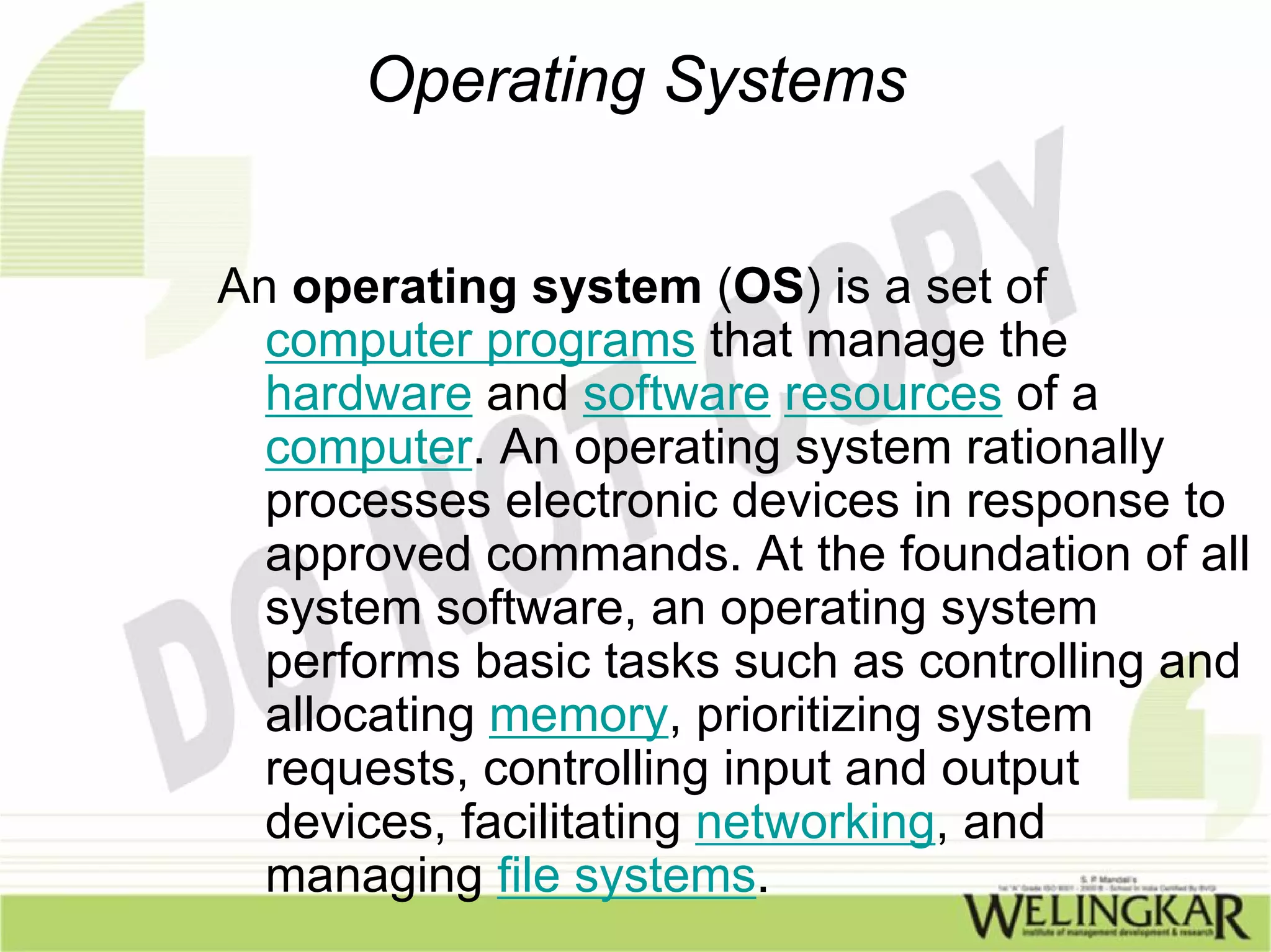 Chapter 6 discusses operating systems (OS), which manage hardware and software resources on computers, and provide services like process and memory management, device management, and networking. Modern OS enable multitasking and employ virtual memory management to optimize memory usage, while supporting various file systems and networking protocols. Additionally, graphical user interfaces are highlighted as integral to user interaction with OS, evolving over time with significant updates in major versions.