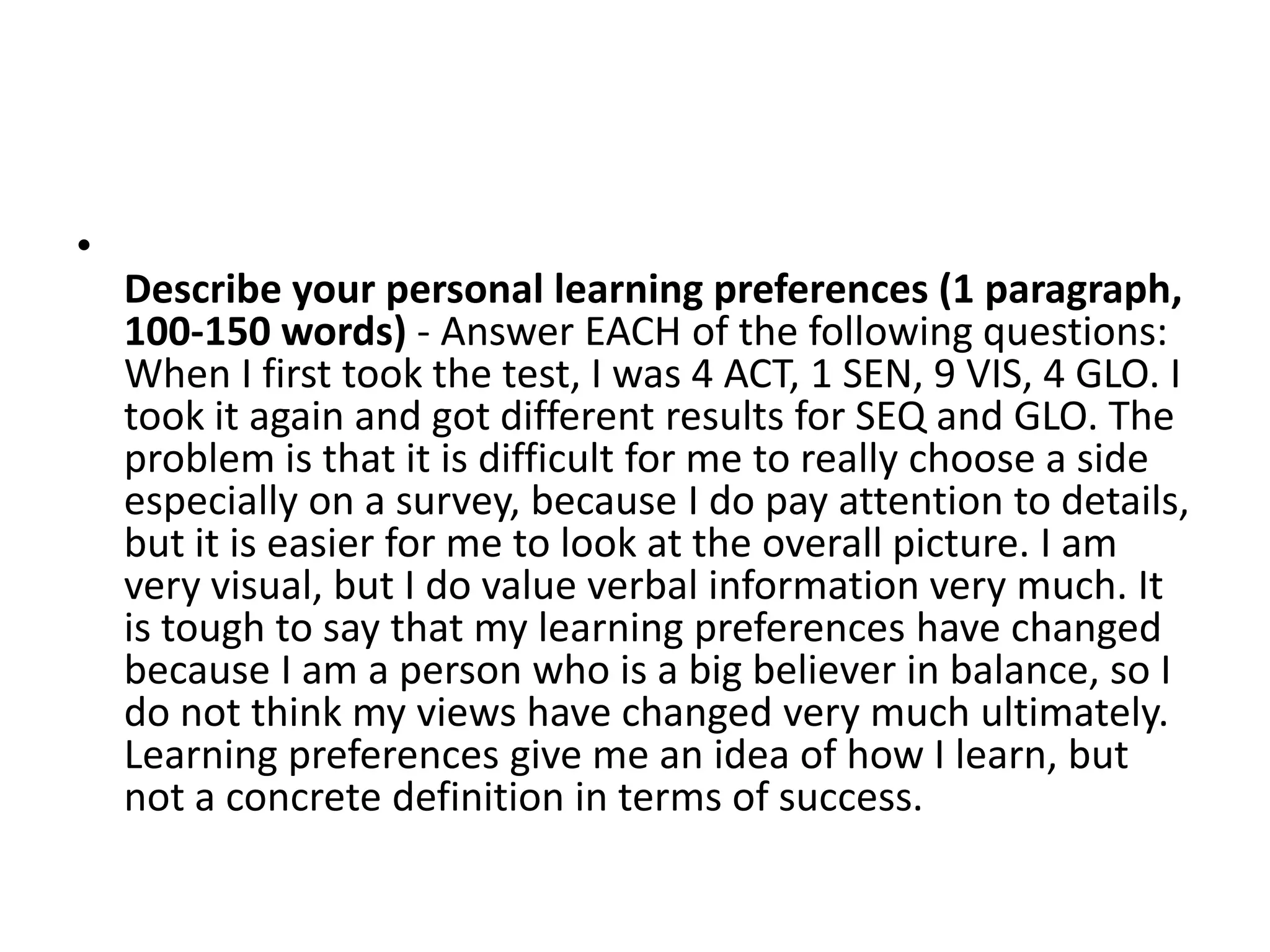 1) The student initially identified as a "Learning Sage" but found value in all three pathways of Explorer, Guide and Sage. Games were particularly helpful for learning due to appealing to multiple preferences.