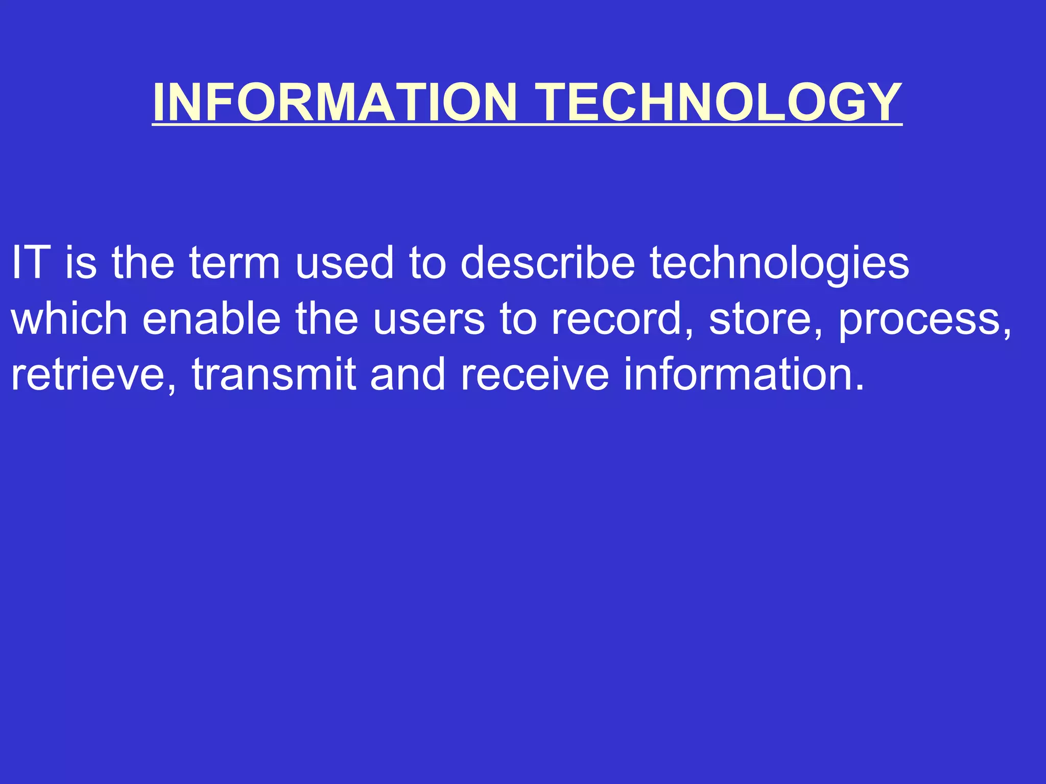 IT refers to technologies that allow users to record, store, process, transmit, and receive information. A computer takes data as input, transforms it according to stored instructions, and outputs the processed information. The central processing unit (CPU) controls and manipulates data in a computer's memory, arithmetic logic unit (ALU), and control unit. The control unit obtains and interprets instructions to notify other components, while the ALU performs logical and arithmetic operations. Memory stores programs and data during processing in volatile, randomly accessible locations. Input and output units convert and display data. Secondary storage provides long-term, non-volatile data storage outside the CPU.