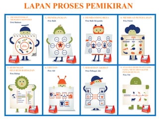 Dokumen menjelaskan delapan proses pemikiran yang berbeda untuk memahami dan menganalisis informasi, termasuk mendefinisikan dalam konteks, menjelaskan, membandingkan perbedaan, membuat klasifikasi, menghubungkan seluruh dan bagian, mengurutkan, menganalisis sebab dan akibat, serta membuat analogi.