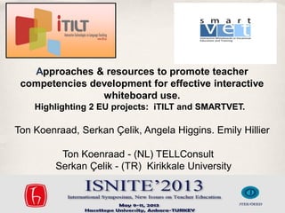 This document summarizes two EU projects, iTILT and SMARTVET, that aimed to promote teacher competencies in using interactive whiteboards. It highlights the projects' training activities and materials developed to help teachers exploit the educational potential of interactive whiteboards. The document also discusses needs analysis and recommendations for developing modules on basic interactive whiteboard functions and designing modular materials. It describes the projects' data collection methods, including classroom filming and interviews, to understand effective interactive whiteboard use and share resources.
