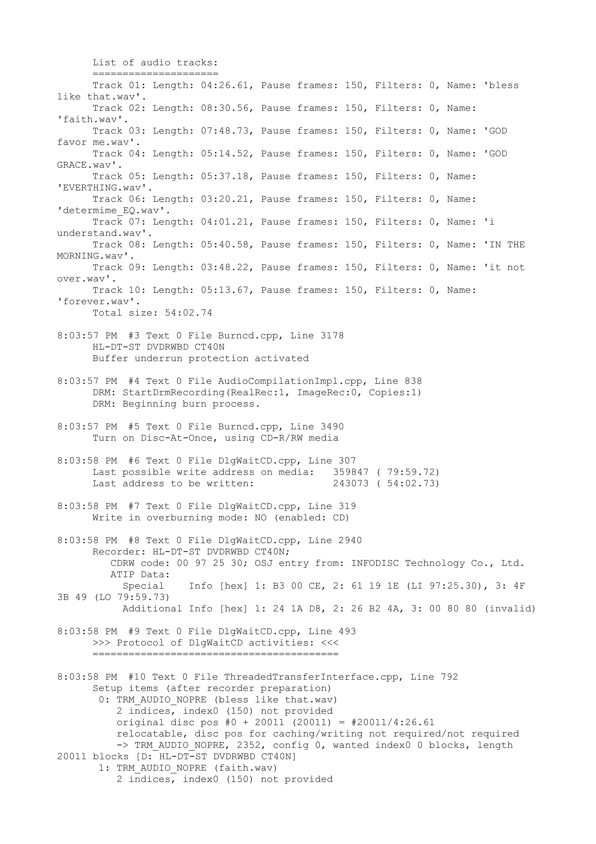The document provides details from the burning of an audio CD using Nero software. It includes information about the hardware and software used, the audio files being burned, and a log of the burning process. The audio CD contains 10 tracks with a total runtime of 54 minutes and contains .wav files. The burning process uses disc-at-once mode on a HL-DT-ST DVD burner and proceeds without issues according to the log.
