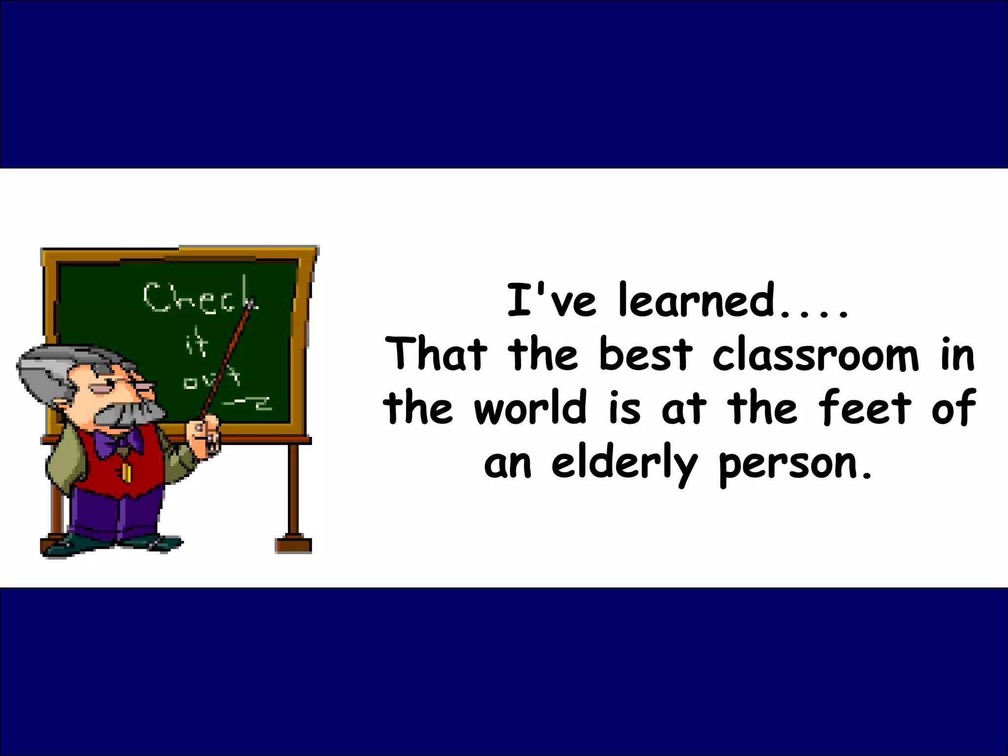The document shares lessons the author has learned over time. It discusses learning from the elderly, showing love, making others feel appreciated, helping others through prayer when unable otherwise, needing goofy friends, understanding others, cherishing time with family, life moving quickly, accepting what is given, appreciating small moments, finding the good in people, patience, choosing actions over feelings, greeting others with kindness, imperfect love, resilience, accepting missed opportunities, avoiding bitterness, expressing love to family, considering words carefully, a smile's power, and growth through challenges. The last lines encourage sharing friendship and finding a circle of friends.