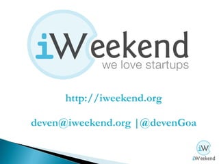 Startup Saturday in Mumbai on February 12th aimed to promote entrepreneurship in new technologies. The event helped entrepreneurs get started on their ideas within two days through speed networking, pitching ideas to get feedback, and working in teams on business plans and prototypes to present on Sunday. The goal was for participants to progress their ideas from the initial inspiration through execution by developing products, finding customers, building teams, and creating business plans and prototypes over the weekend. Attendees were encouraged to enjoy the learning process and keep pursuing their entrepreneurial ideas and projects.
