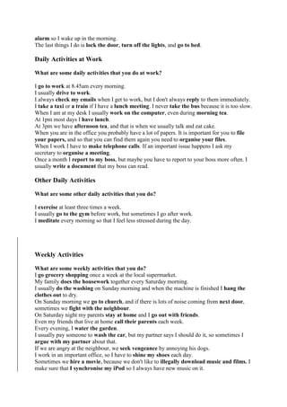 The document describes a person's typical daily and weekly routine. In the mornings, they wake up at 5:00 am, press snooze five times, have a shower, watch TV during breakfast, and go to work at 7:30 am. At work, they check emails, work on the computer, have lunch at 1:00 pm, make phone calls, and leave at 5:00 pm. Evenings involve dinner with family at 6:30 pm, resting, and weekend activities like shopping, picnics, or reading. On weekends, they sleep in and do chores like laundry on Sunday morning.