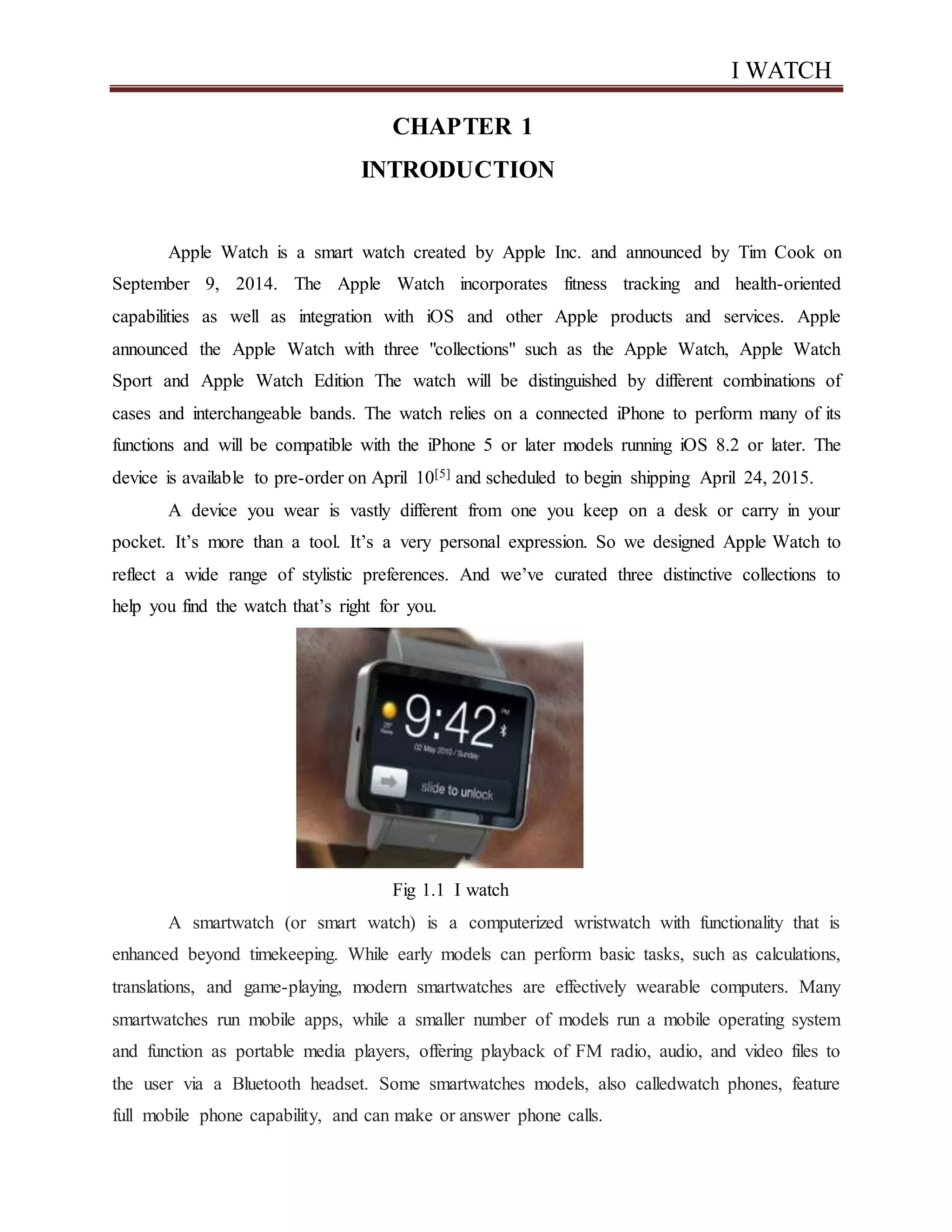 The document provides an overview of the Apple Watch, including:
