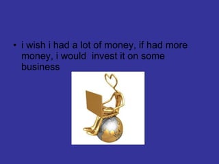 The document outlines several wishes of the author, including having more money to invest in business, owning a Ferrari to drive everywhere, traveling to London to improve their English skills, sleeping more by not having to wake up early, traveling daily to experience different cultures, getting excellent grades to work for a good company, living alone in a big apartment to throw parties, not having late classes to allow for more gym time, stopping time to fit more into each day, and having a plane to fly anywhere in the world.