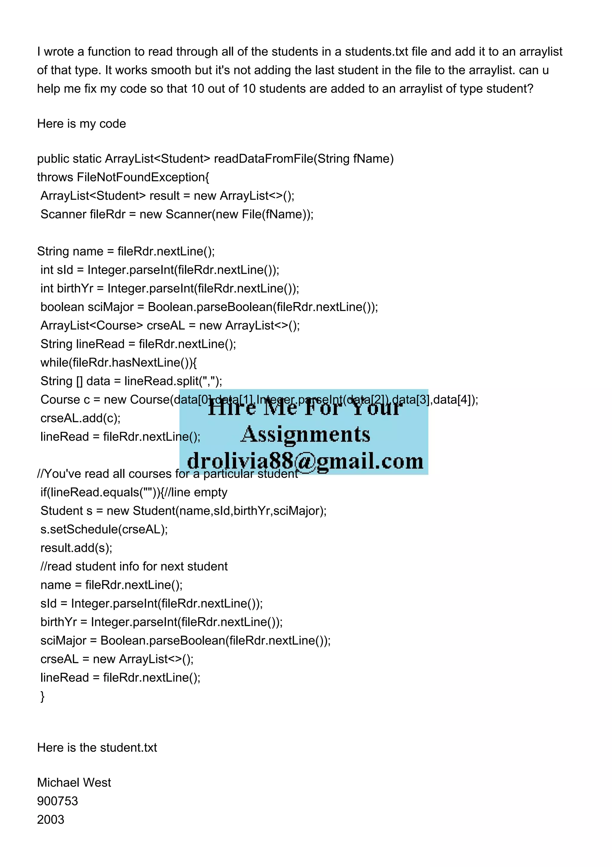 The document describes a Java function designed to read student data from a text file and populate an ArrayList with Student objects. The code currently fails to add the last student due to an issue with the loop not processing the final student when the file has no further lines after their data. The user seeks assistance to ensure that all student entries are accurately included in the ArrayList.