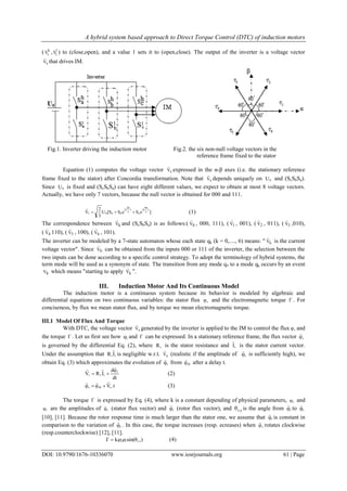 This document describes a hybrid system approach to modeling direct torque control of an induction motor coupled to an inverter. It first models the direct torque control as a hybrid system, with a discrete event dynamics defined by the inverter voltage vectors, and continuous dynamics defined by the stator flux vector and electromagnetic torque. It then abstracts the continuous dynamics in terms of discrete events representing the flux and torque entering/exiting a working point region, and the passage of the flux vector between zones. Finally, it uses supervisory control theory to drive the inverter-motor system to a desired working point by controlling the discrete event dynamics.