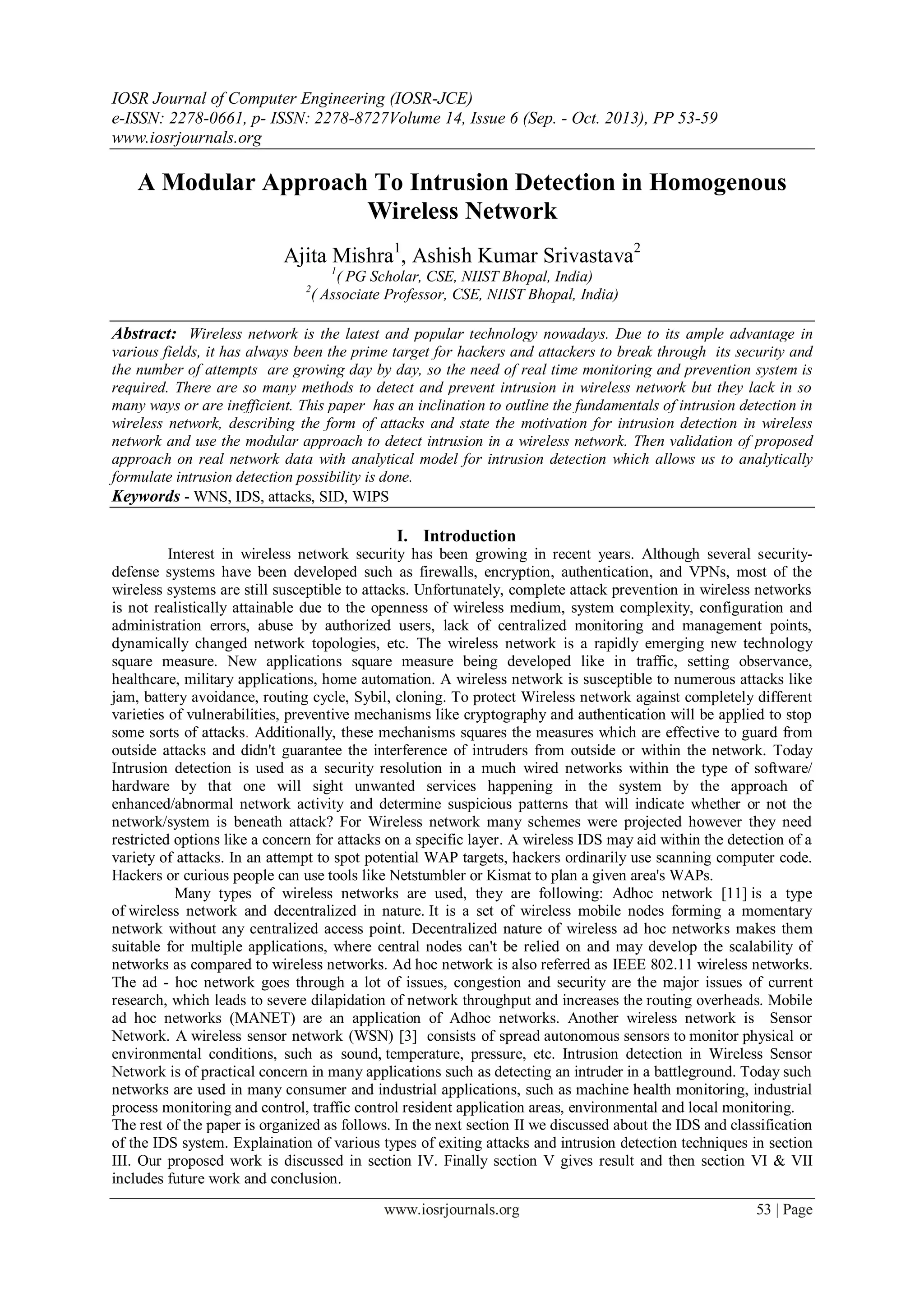 This document discusses a modular approach to intrusion detection in homogeneous wireless networks. It begins by introducing wireless networks and the need for intrusion detection systems (IDS) due to security vulnerabilities. It then discusses different types of IDS, including signature-based detection that identifies known attacks, and anomaly-based detection that identifies deviations from normal behavior but can result in high false positives. The document proposes a modular approach combining advantages of signature-based and anomaly-based detection for high detection rates and low false positives. Requirements for IDS in wireless networks are also outlined.