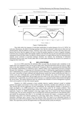 This document summarizes a research paper that examines using fuzzy logic to reduce the bullwhip effect in supply chains caused by rationing and shortage gaming. It first defines the bullwhip effect and describes rationing and shortage gaming as a cause. It then discusses related work applying fuzzy logic to supply chain problems. Next, it examines the impact of rationing and shortage gaming on the bullwhip effect in more detail. It provides an overview of fuzzy logic and how it can be applied to model rationing and shortage gaming using a fuzzy logic-based approach. Finally, it proposes a fuzzy system model for resolving rationing and shortage gaming issues in the supply chain.