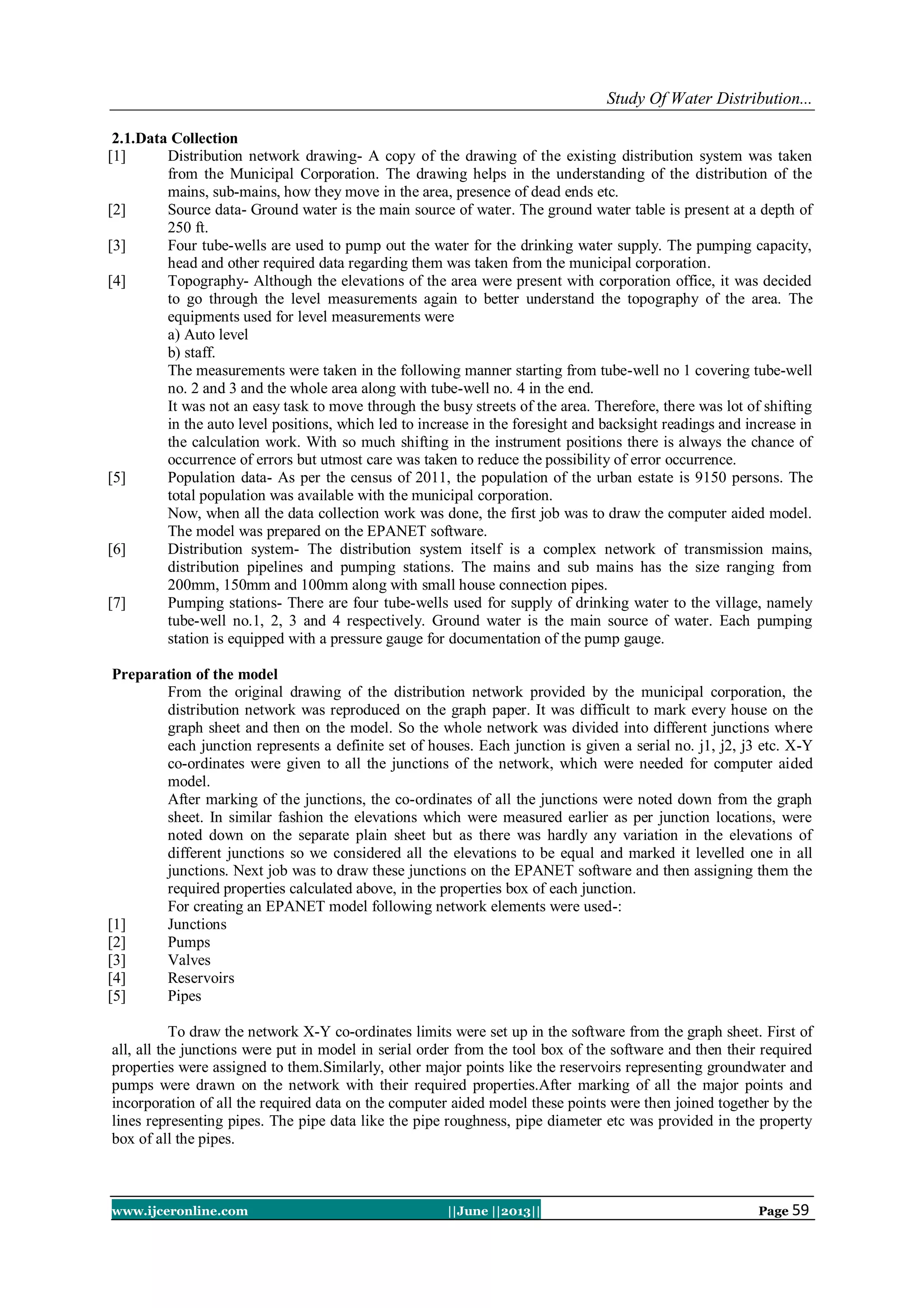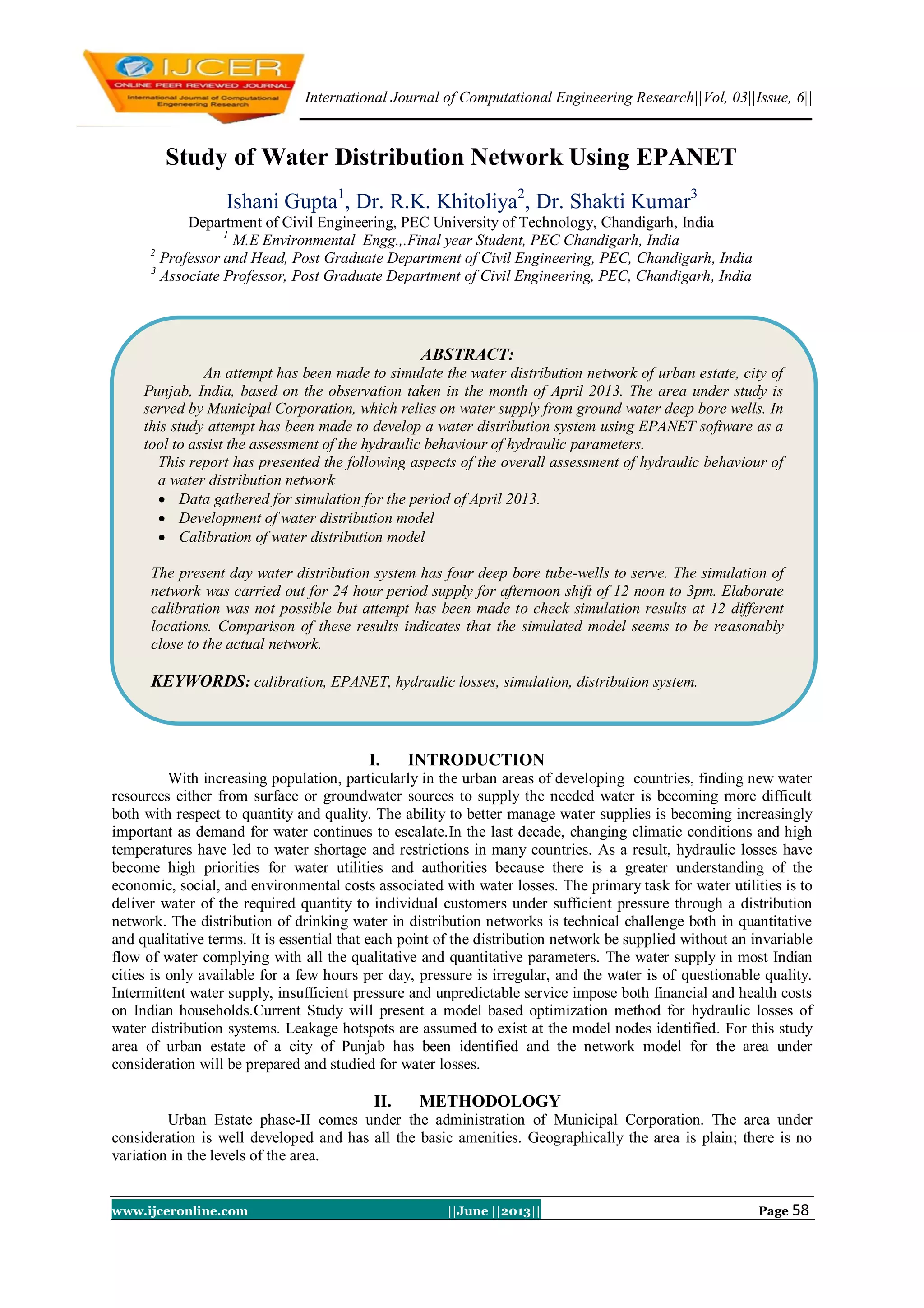The document discusses a study of the water distribution network in an urban estate in Punjab, India, focusing on hydraulic losses and quality challenges due to intermittent supply and pressure issues. Utilizing EPANET software, a simulation model was developed based on data collected in April 2013, and preliminary results indicated that the system does not meet the desired pressure standards. The study highlights the need for better water management and infrastructure improvements to address shortages and optimize the distribution systems.