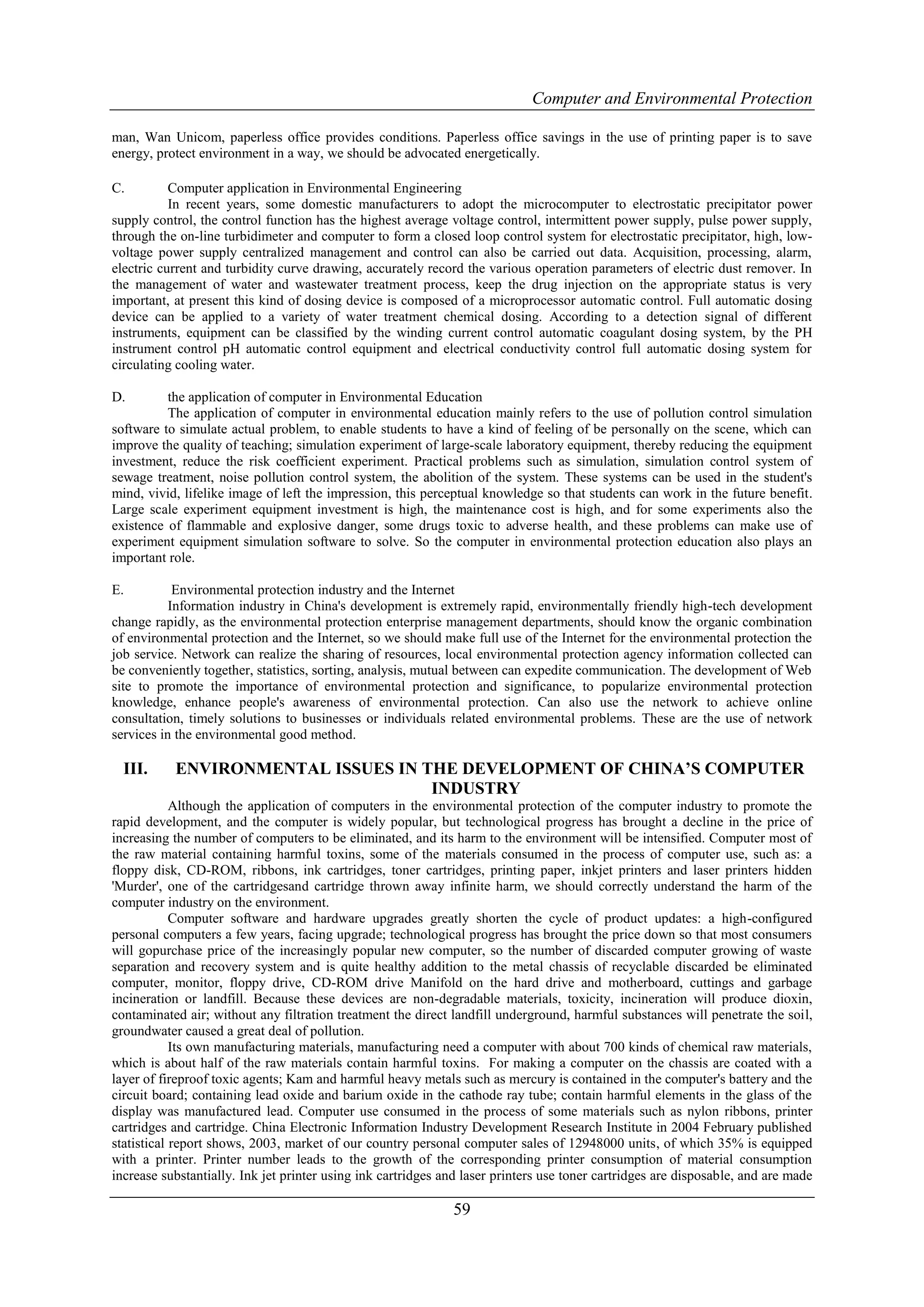 3) While computers have benefits for environmental protection, China needs measures to reduce hazards from the computer industry through regulations, non-toxic materials, and recycling programs.