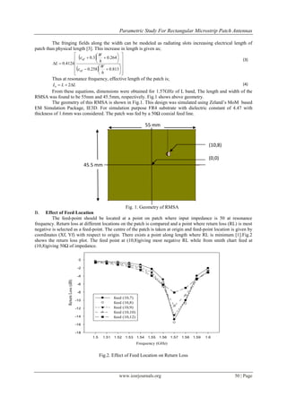 The paper presents a parametric study of rectangular microstrip patch antennas (RMSAs), analyzing various parameters affecting their performance, such as return loss, bandwidth, and input impedance. It discusses the design of RMSAs using EM simulation and investigates the impact of changes in width, height, substrate dielectric constant, and loss tangent on antenna characteristics. The findings suggest that increasing height enhances bandwidth while decreasing width and dielectric constant improves resonance frequency.