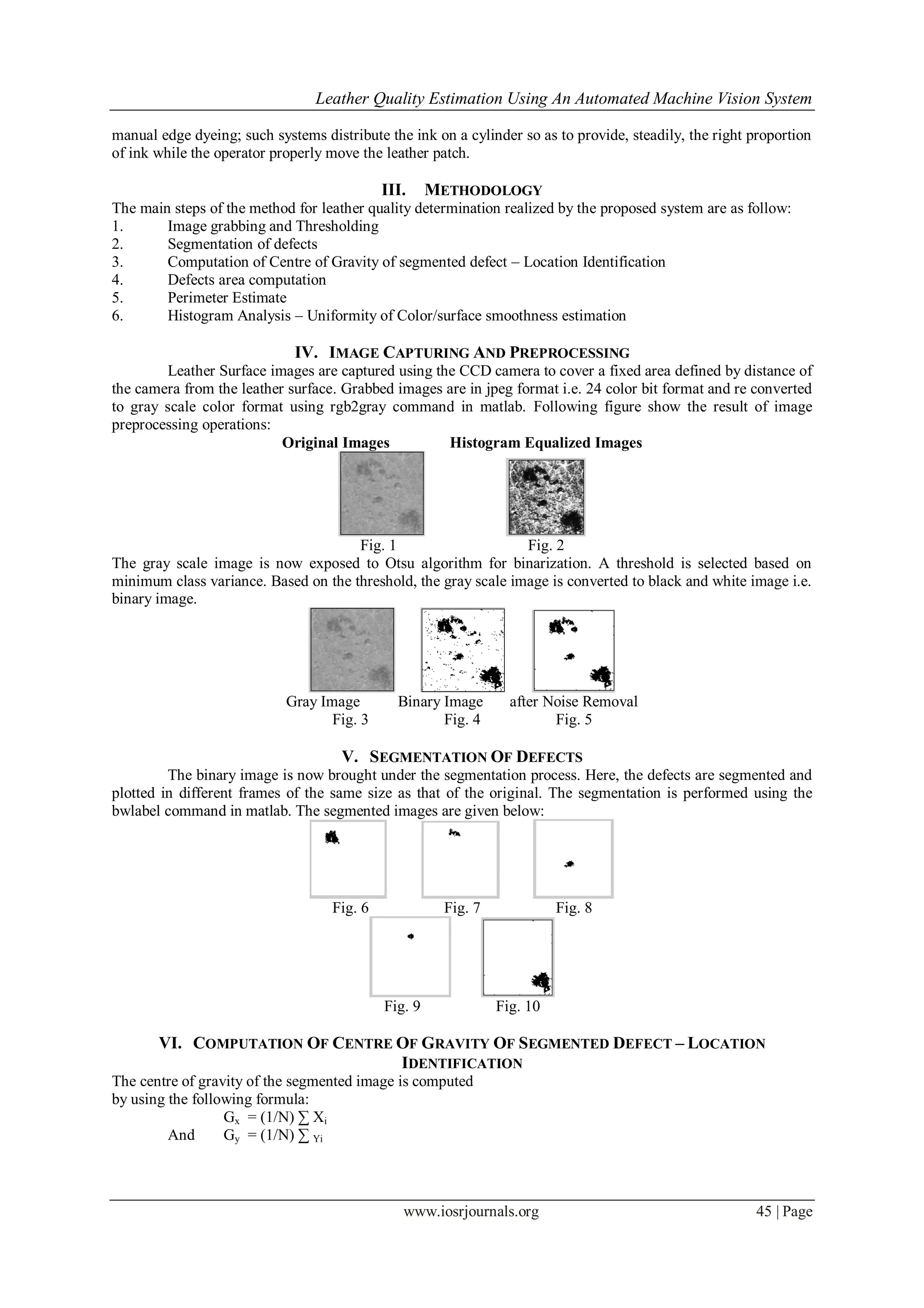 This document describes a proposed machine vision system to automate the inspection and quality estimation of leather materials. Key steps of the proposed methodology include image acquisition, preprocessing, segmentation of defects, computation of defect features like location, area, perimeter, and a histogram analysis to estimate surface smoothness. These quantitative defect features would be compiled into a feature vector to objectively determine the quality of the leather in a standardized way. Related works on automated leather inspection and applications of machine vision in leather manufacturing processes are also reviewed. The proposed system aims to provide repeatable, consistent and time-efficient leather quality assessment compared to manual inspection.