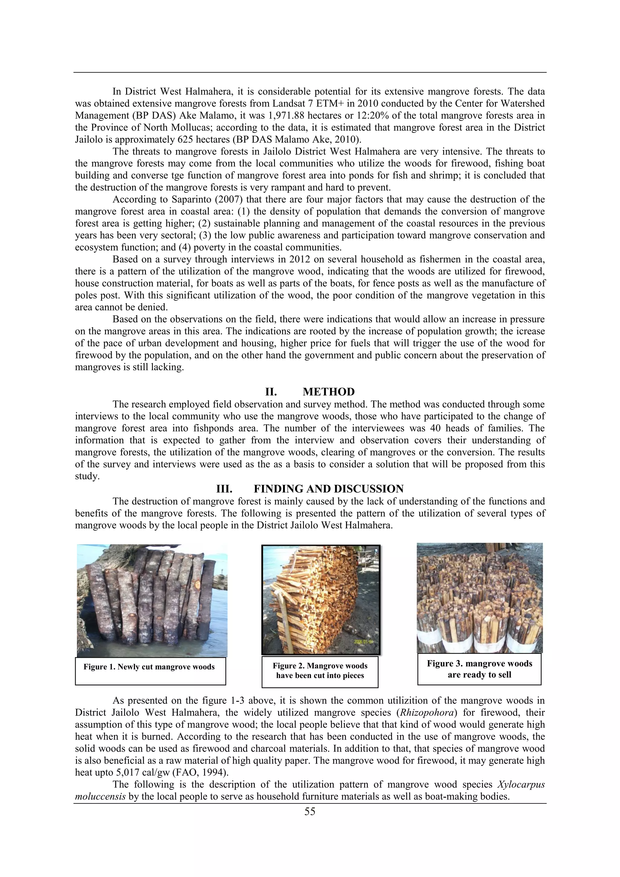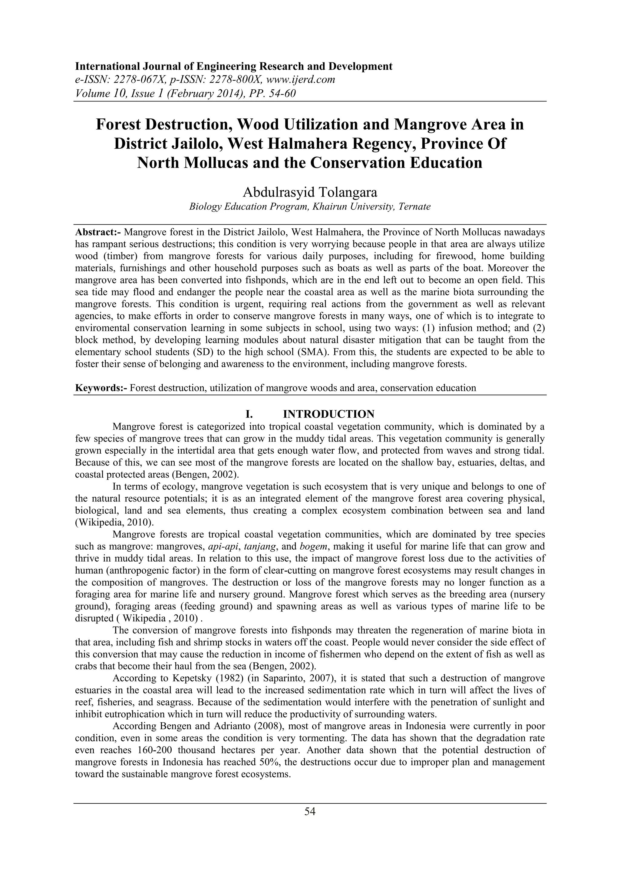 This document discusses the destruction of mangrove forests in the District of Jailolo, West Halmahera Regency, North Maluku Province, Indonesia. The mangrove forests in this area are being rapidly destroyed through the local community's utilization of wood from the mangroves for firewood, building materials, and conversion of mangrove areas to fishponds. This destruction threatens the region's coastal protection, marine life habitats, and livelihoods of local fishermen. The document calls for conservation education programs in local schools to increase awareness of the importance of mangrove forest protection.