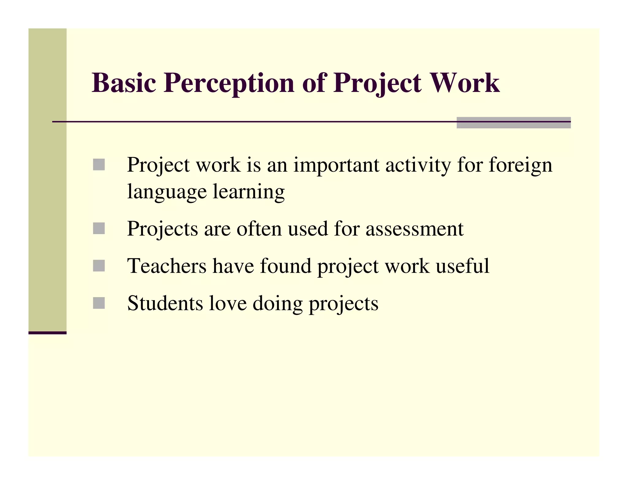 The document provides effective strategies for conducting project work in Chinese language classes, including providing guidance to students at different stages of projects, allowing student choice, and making projects iterative processes that incorporate both group work and individual learning. It also discusses potential problems with projects and their causes, as well as how to design projects to meet language learning objectives and assess student performance.
