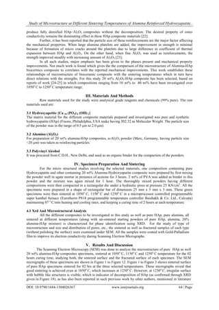 The document studies the microstructure of pure hydroxyapatite (HAp) and a 20% alumina-reinforced HAp bioceramic composite sintered at different temperatures. Scanning electron microscopy revealed that pure HAp sintered at 1250°C had an irregular bubbly surface and well-distributed pores, indicating decomposition. The composite sintered up to 1250°C maintained a dense microstructure with small pores (<3 μm), explaining its higher strength compared to pure HAp. The addition of alumina prevented pore growth at high temperatures, negating the negative effects of HAp decomposition.