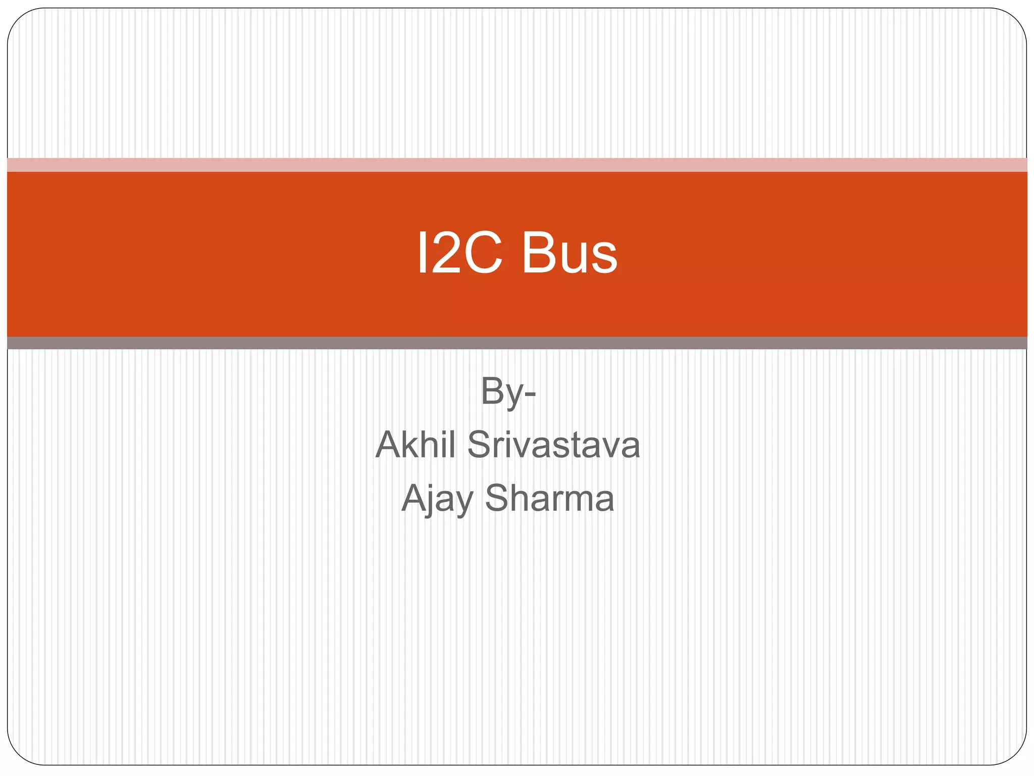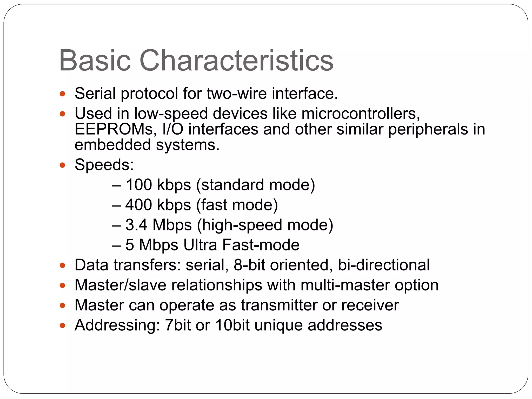 This document summarizes the key characteristics and protocol of the I2C bus, which is a serial communication protocol used in embedded systems. It operates at speeds up to 5Mbps and uses just two bidirectional open-drain lines: a serial data line and a serial clock line. The I2C protocol uses a master-slave architecture, where the master device initiates data transfers by sending a start signal and addressing a slave device to read or write data. Transfers use 7 or 10-bit addressing and are acknowledged by the slave after each byte. The protocol supports multiple masters that must synchronize clocks and arbitrate access to the data line.