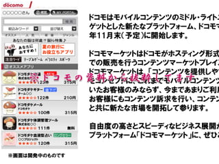 ドコモマーケットがはじまるのだ。 12月はじめにオープン。 予定からちょっとのびちゃった。 なんだかんだ言って、ユーザーはま だまだ多い 今、Androidは50万くらい? iアプリ対応機はたぶんウン千万台ある 課金への敷居が低い(かも)