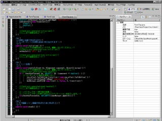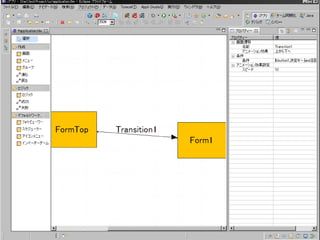 SOGフレームワークというものを使っ て開発ができる プラットフォームの違いを吸収してい るらしい(DoJa、Star、MIDP) 画面同士の結び付き(フロー)と、画面 デザイン(フォーム)でアプリが作れる 画面を作るには、フォームにコンポー ネントを貼り付けるだけ