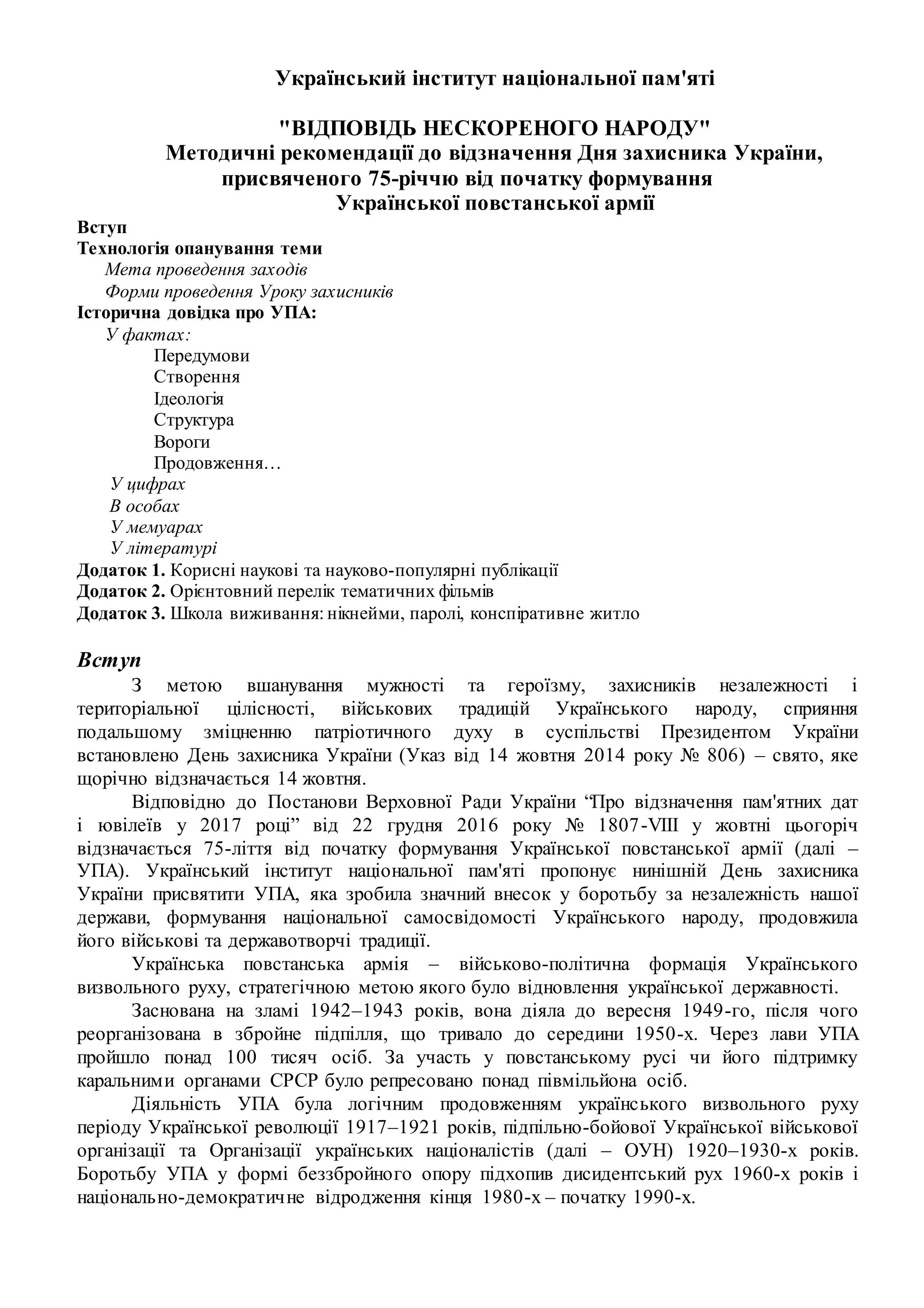 УПА). Український інститут національної пам'яті пропонує нинішній День захисника