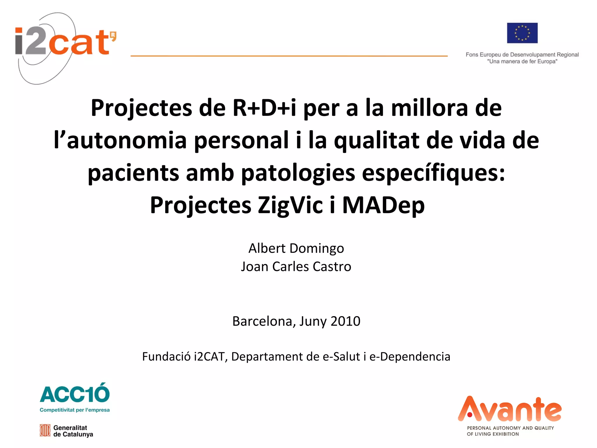 Projectes de R+D+iper a la millora de l’autonomia personal i la qualitat de vida de pacients amb patologies específiques: Projectes ZigVic i MADep Albert Domingo Joan Carles Castro Barcelona, Juny 2010 Fundació i2CAT, Departament de e-Salut i e-Dependencia