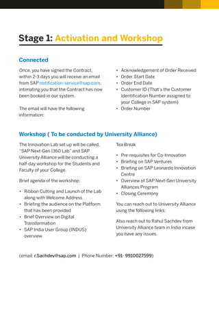 The document provides information about the stages involved in the SAP I360 program for universities. It details the initial activation and workshop, involvement with the INDUS user group to work on projects, opportunities for proof of concept projects with customers, collaboration with system integration partners, and showcase opportunities. Later stages include working with the SAP Innovation Center, co-innovation lab, and going to market.