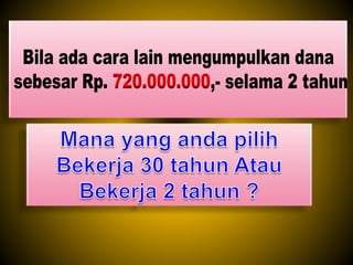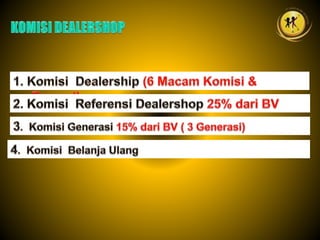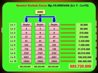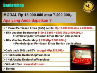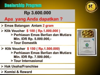 Dokumen ini menjelaskan sistem dukungan sukses dari Alam Semesta Academy yang memfokuskan pada investasi emas dan pengusaha emas dengan konsep integrated 3D system (i3ds). Terdapat analisis keuntungan investasi emas, perkembangan nilai emas dari waktu ke waktu, serta pendekatan pemasaran melalui e-commerce. Selain itu, terdapat rincian mengenai struktur perusahaan dan peluang menjadi dealer dengan modal kecil dan risiko rendah.