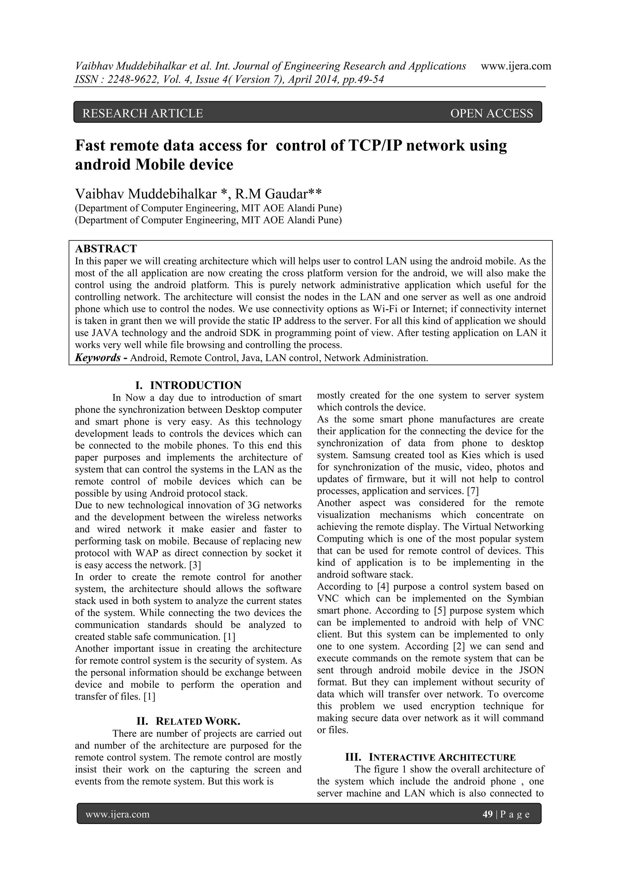 This document discusses the architecture for a network administrative application that allows remote control of LAN systems via an Android mobile device. The architecture includes a server and client module, utilizing Java and Android SDK, which enables users to perform various operations such as process management and file manipulation over both Wi-Fi and the internet. Security measures, including encryption for data transfer, are implemented to safeguard personal information during the operation.