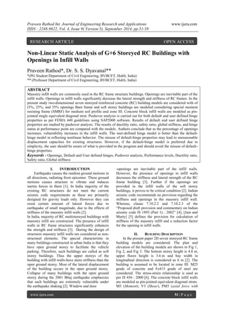 The study analyzes the impact of openings in masonry infill walls on the lateral strength and stiffness of seven-storey reinforced concrete buildings. Using pushover analysis, the findings reveal that increasing the percentage of openings leads to higher vulnerability in the infill walls, and user-defined hinge models perform better than default models in reflecting nonlinear behavior. Recommendations are made regarding the use of hinge properties to avoid unreasonable displacement capacities in existing structures.