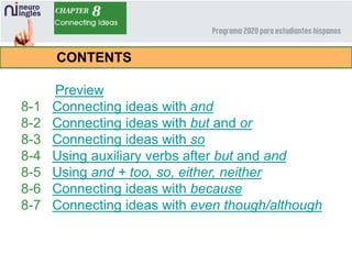 This document provides instruction on connecting ideas in sentences using conjunctions such as and, but, or, so, even though, although, and because. It includes examples of how to correctly use commas with these conjunctions when joining two independent clauses or listing items. The document also discusses using auxiliary verbs after but and and. Exercises are provided throughout for practice applying the concepts.