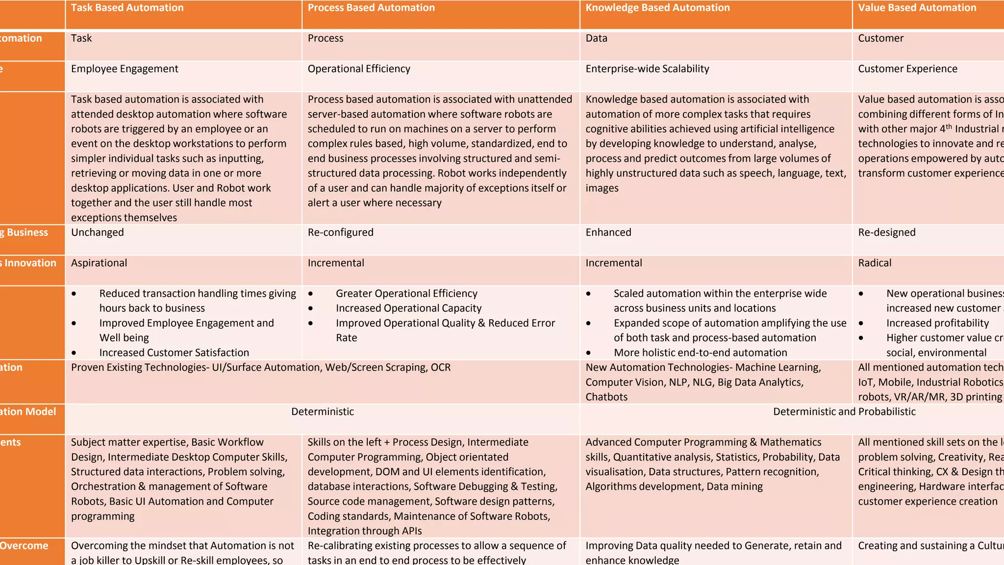The document discusses various forms of automation including task-based, process-based, knowledge-based, and value-based automation, emphasizing their roles in improving operational efficiency and customer experience. It details the differences in implementation from attended desktop automation to complex server-based processes, highlighting the importance of integrating AI and other technologies. The text also addresses the need for upskilling employees to adapt to automation and enhance data quality.