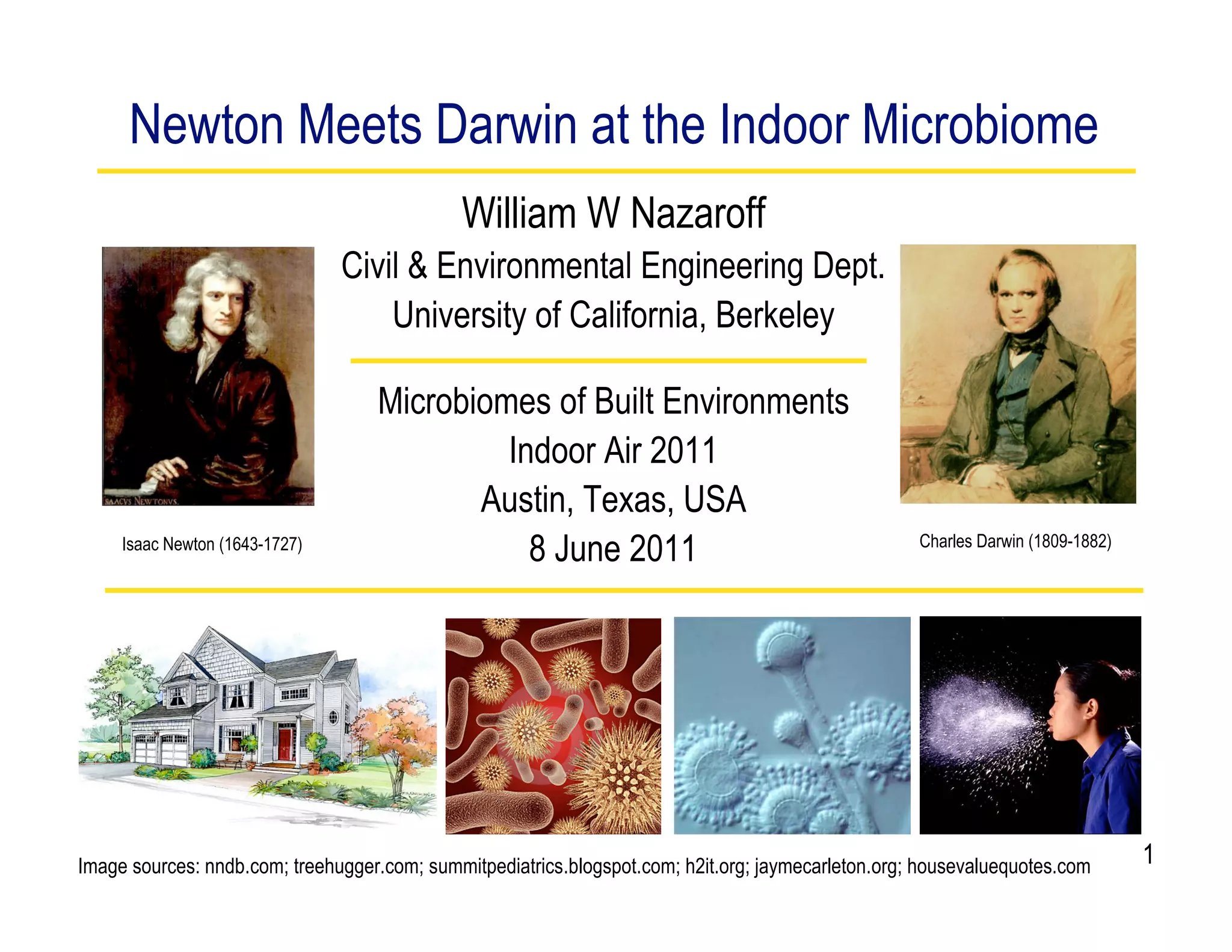 This document discusses a talk given by William W Nazaroff on collaborating to study indoor microbiomes from Newtonian and Darwinian perspectives. It summarizes Harte's analysis of how physicists and ecologists approach their work differently, with physics seeking simplicity and universality while ecology finds increasing complexity. Nazaroff observes successful collaborations occur in small groups that foster mutual trust, teaching, and credit-sharing. Studying indoor microbiomes provides opportunities to advance understanding, though sustained support and challenging assumptions will be needed to overcome inertia. Nazaroff's own collaboration with Peccia's lab is producing results on indoor bacteria and fungi emissions.