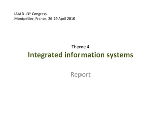 The document discusses several integrated information systems that aim to add value to information by repackaging and repurposing content according to audience needs. It notes common objectives around sustainability, classification systems, protocols and standards, validation of information, and identification and integration of sources. The systems presented include Crop Genebank Knowledge Base, CERISA, SIDALC, SIIS, a global database on invasive species, Vigicultures, and others.