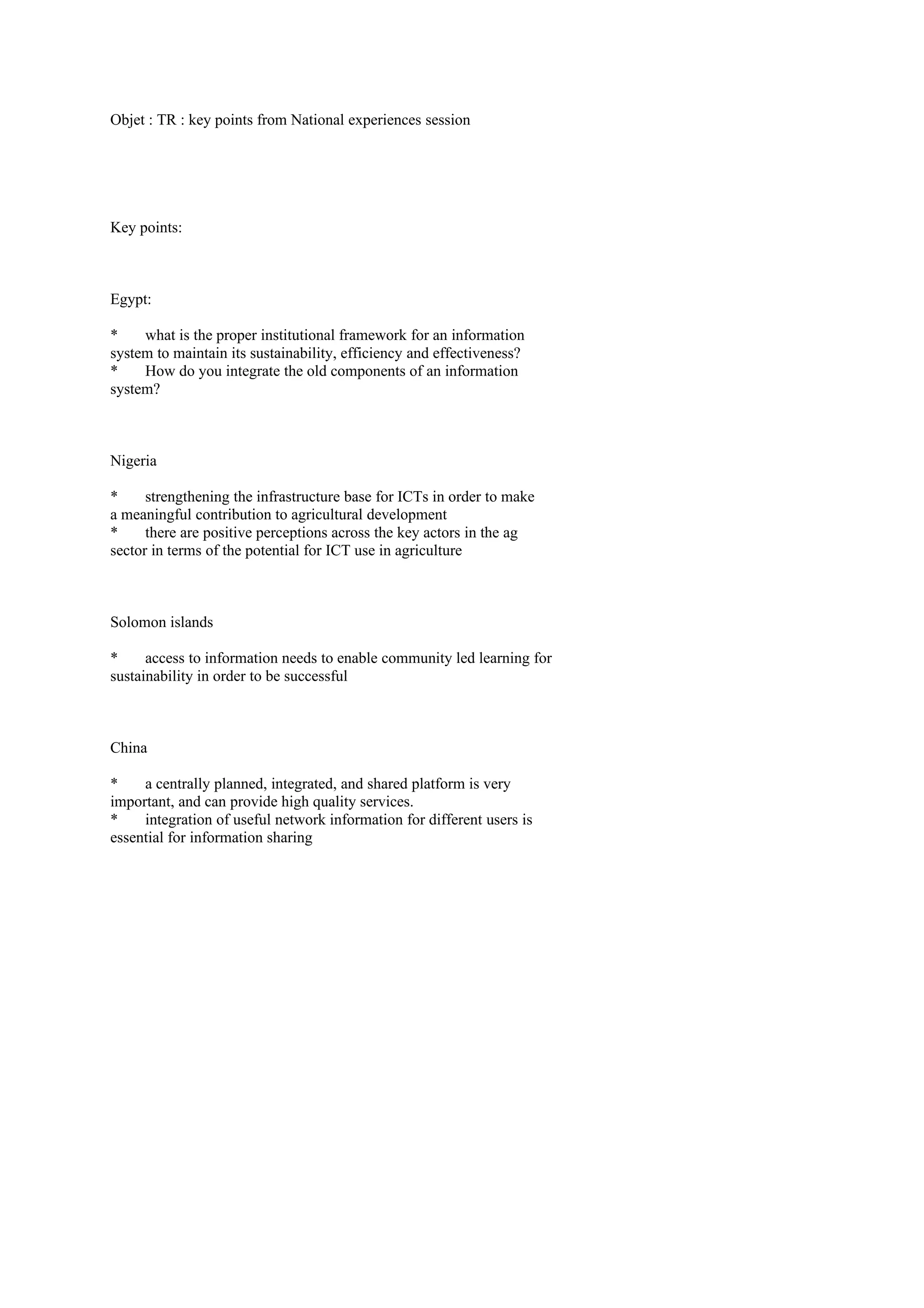 The document outlines key points from different national experiences regarding information systems and agriculture. Egypt emphasizes the need for a proper institutional framework and integration of old components, while Nigeria focuses on strengthening ICT infrastructure for agricultural development. The Solomon Islands highlight the importance of community-led learning, and China advocates for a centrally planned platform for effective information sharing.